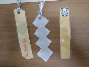 ラミネート加工して本に挟むしおりを作成しました。