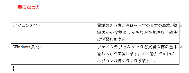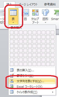 「挿入タブ」-「表」-「文字列を表にする」を選択します。